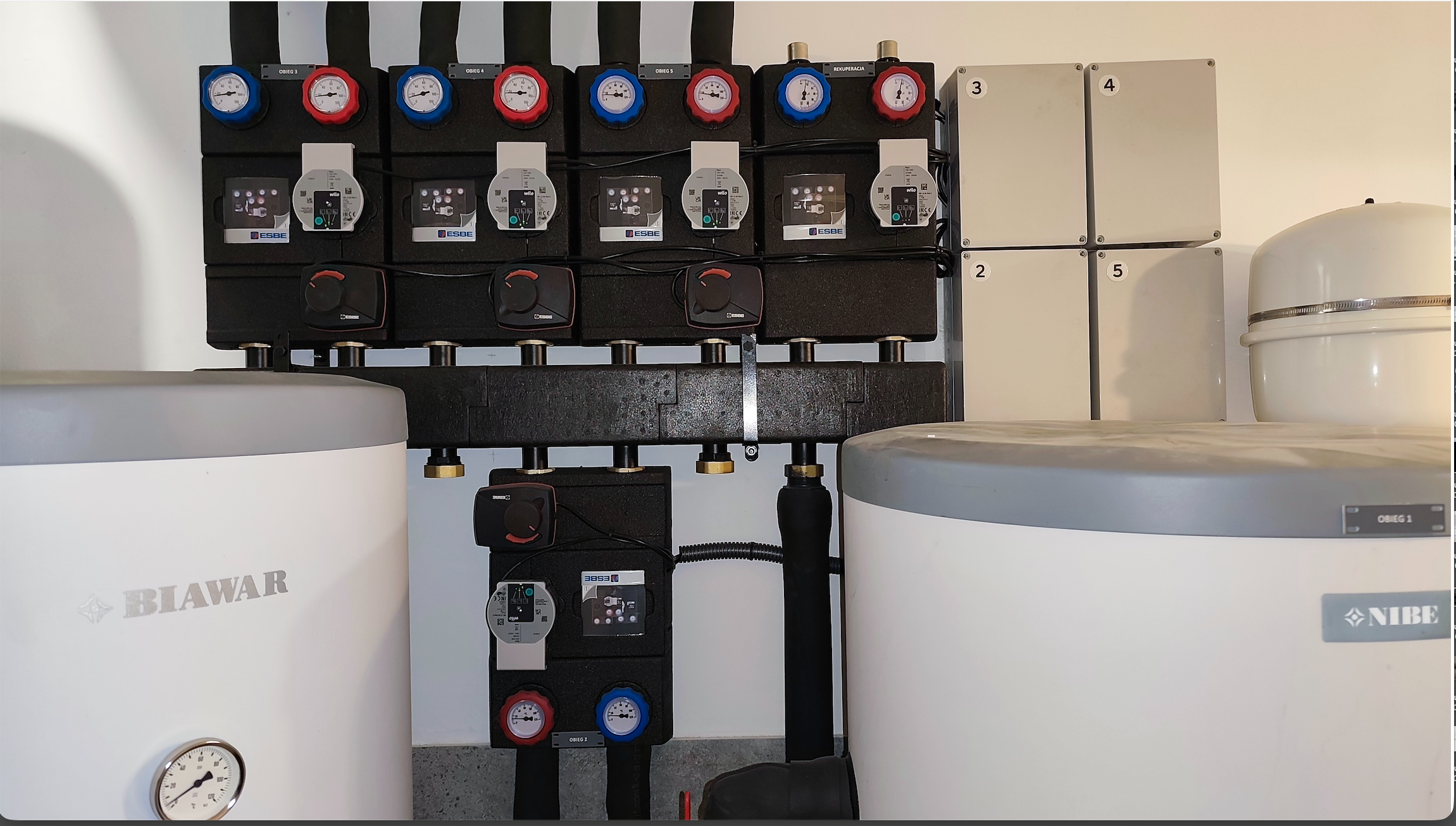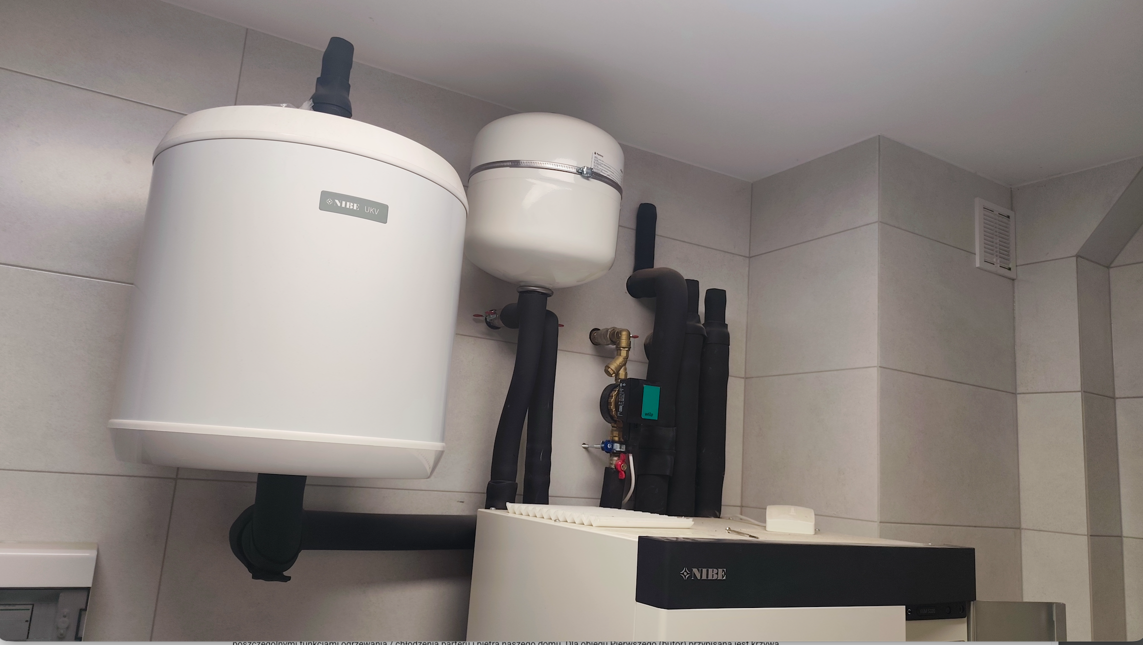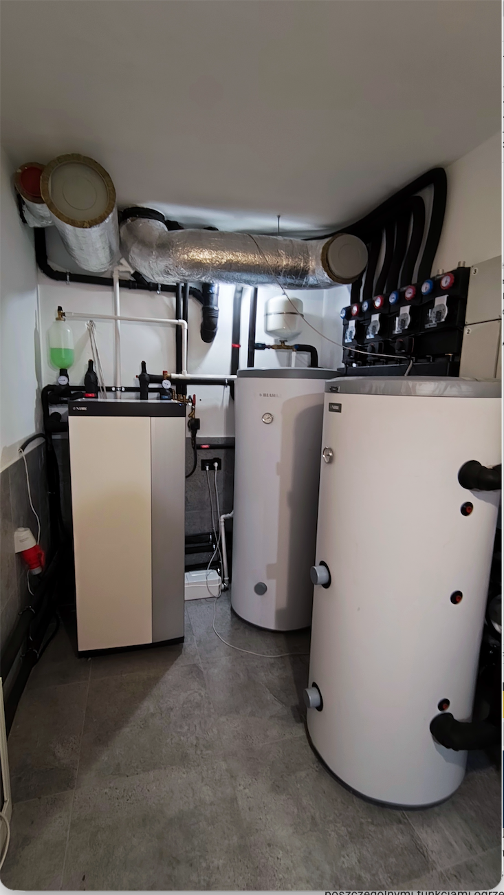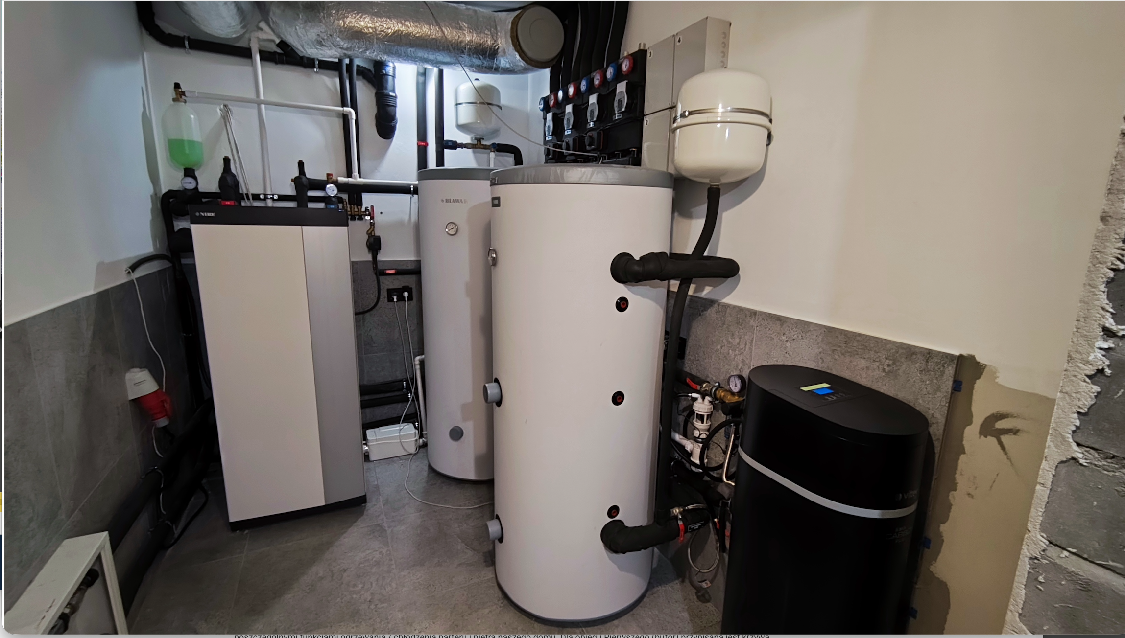 Zbiornik buforowy wody kotłowej pełni kilka funkcji – zwiększenie pojemności zładu, rozsprzęglenie obiegów grzewczych, jest Pierwszym obiegiem grzewczo / chłodzącym. Natomiast grupy pompowe zamontowane na rozdzielaczu głównym, przypisane są do każdej z dwóch kondygnacji. Obie wyposażone są w zawory mieszające. Dzięki takiemu układowi mam możliwość różnej konfiguracji / sterowania poszczególnymi funkcjami ogrzewania / chłodzenia parteru i piętra naszego domu. Dla obiegu Pierwszego (bufor) przypisana jest krzywa grzania i chłodzenia „X” – to jest najważniejsza krzywa. Co do zasady piętro potrzebuje więcej ciepła zimą i chłodu latem. Dzięki temu mogę dla piętra ustawić wyższe parametry pracy adekwatne dla danego sezonu, a dla parteru niższe. Natomiast gdy piętro nie jest / nie będzie codziennie używane (dzieci się wyprowadzą, okazjonalnie będą przebywali tam nasi goście) to na ten czas można zmienić nastawy w taki sposób, aby zimą utrzymywać tam niższą temperaturę niż na parterze. Oponenci powiedzą, że można zamontować czujniki temperatury pokojowej i uzyskać podobny efekt. Oczywiście, że można, ale ja uważam, że w pierwszym etapie powinno się sterować pracą źródła ciepła (chłodu) a nie odbiornikiem. Per analogia. Jadąc samochodem aby zmniejszyć prędkość nie powinno się wciskać pedału hamulca nie zmieniając położenia pedału gazu, tylko odpuścić gaz. Tym samym – korzystając z pracy pompy ciepła nie powinno ustawiać się wysokiej krzywej grzania po to, aby na odbiorniku i za pośrednictwem termostatu pokojowego ustawiać niższą temperaturę, niż wynika to z nastawy krzywej grzania … Taka praca jest nieekonomiczna i pobawiona logiki, dodatkowo / długofalowo wpływa na szybsze zużycie sprężarki.