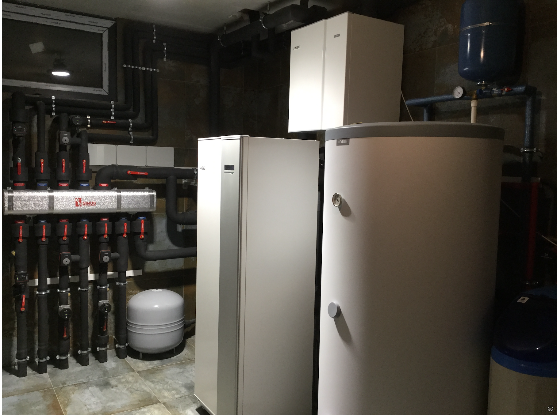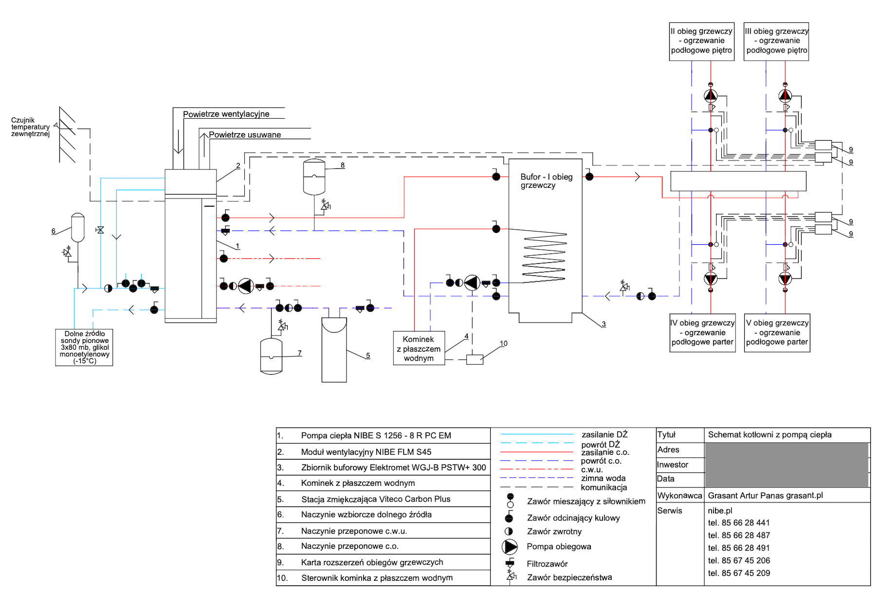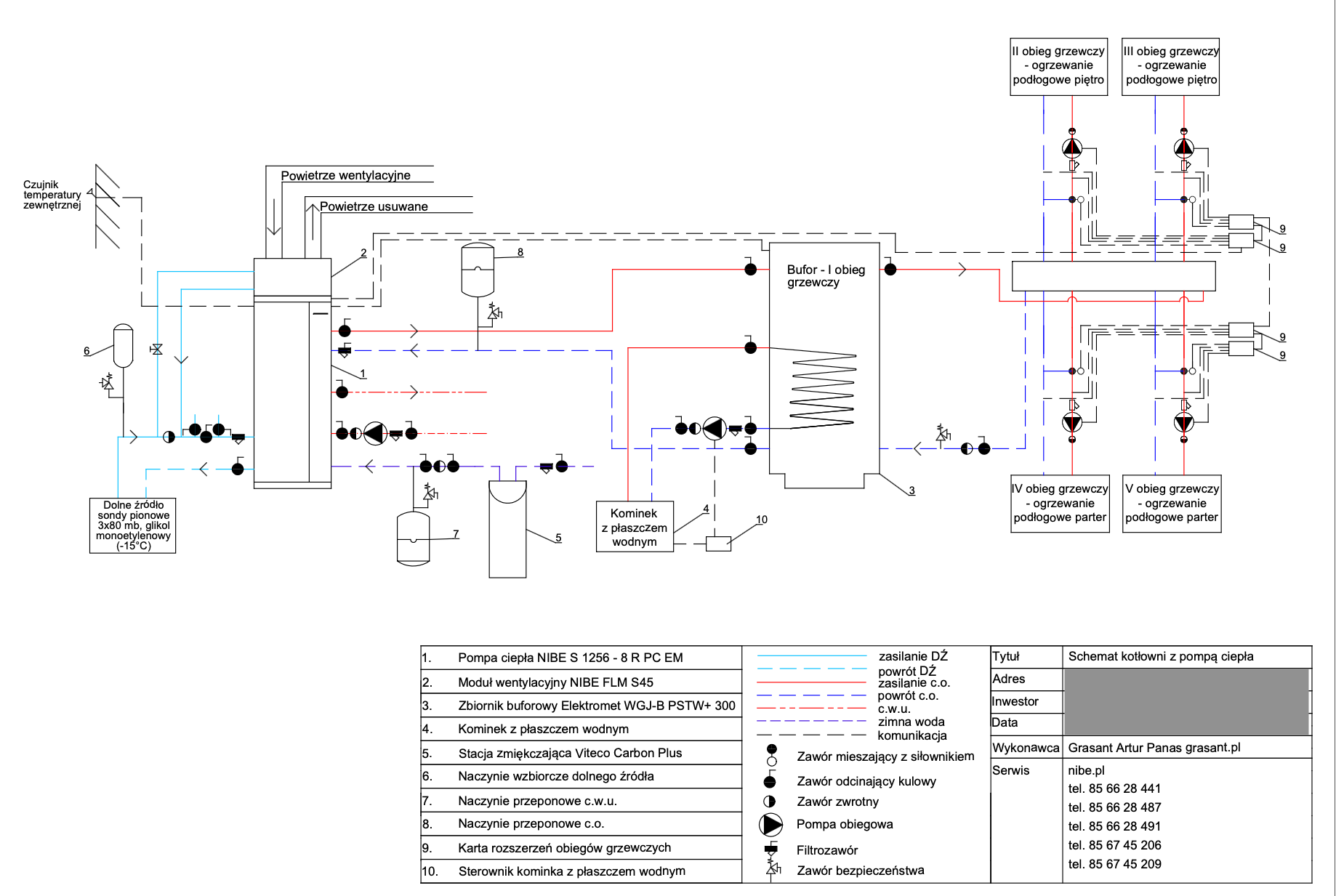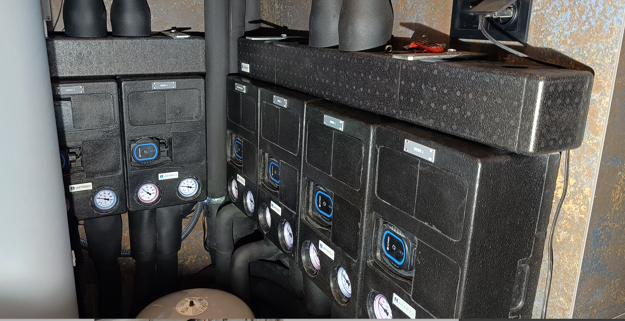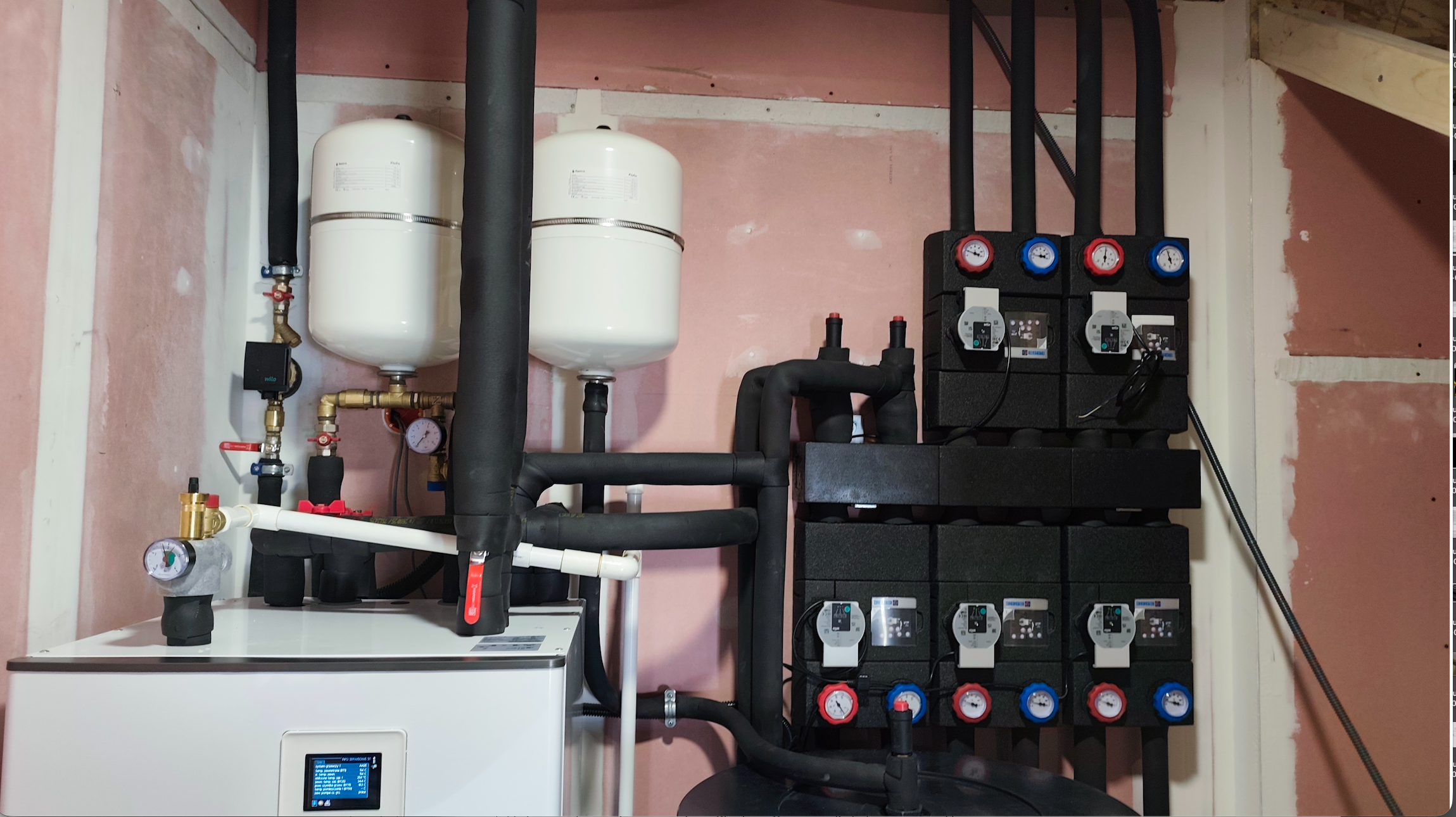 Zbiornik buforowy wody kotłowej pełni kilka funkcji – zwiększenie pojemności zładu, rozsprzęglenie obiegów grzewczych, jest Pierwszym obiegiem grzewczo / chłodzącym. Natomiast grupy pompowe zamontowane na rozdzielaczu głównym, przypisane są do każdej z dwóch kondygnacji. Obie wyposażone są w zawory mieszające. Dzięki takiemu układowi mam możliwość różnej konfiguracji / sterowania poszczególnymi funkcjami ogrzewania / chłodzenia parteru i piętra naszego domu. Dla obiegu Pierwszego (bufor) przypisana jest krzywa grzania i chłodzenia „X” – to jest najważniejsza krzywa. Co do zasady piętro potrzebuje więcej ciepła zimą i chłodu latem. Dzięki temu mogę dla piętra ustawić wyższe parametry pracy adekwatne dla danego sezonu, a dla parteru niższe. Natomiast gdy piętro nie jest / nie będzie codziennie używane (dzieci się wyprowadzą, okazjonalnie będą przebywali tam nasi goście) to na ten czas można zmienić nastawy w taki sposób, aby zimą utrzymywać tam niższą temperaturę niż na parterze. Oponenci powiedzą, że można zamontować czujniki temperatury pokojowej i uzyskać podobny efekt. Oczywiście, że można, ale ja uważam, że w pierwszym etapie powinno się sterować pracą źródła ciepła (chłodu) a nie odbiornikiem. Per analogia. Jadąc samochodem aby zmniejszyć prędkość nie powinno się wciskać pedału hamulca nie zmieniając położenia pedału gazu, tylko odpuścić gaz. Tym samym – korzystając z pracy pompy ciepła nie powinno ustawiać się wysokiej krzywej grzania po to, aby na odbiorniku i za pośrednictwem termostatu pokojowego ustawiać niższą temperaturę, niż wynika to z nastawy krzywej grzania … Taka praca jest nieekonomiczna i pobawiona logiki, dodatkowo / długofalowo wpływa na szybsze zużycie sprężarki.