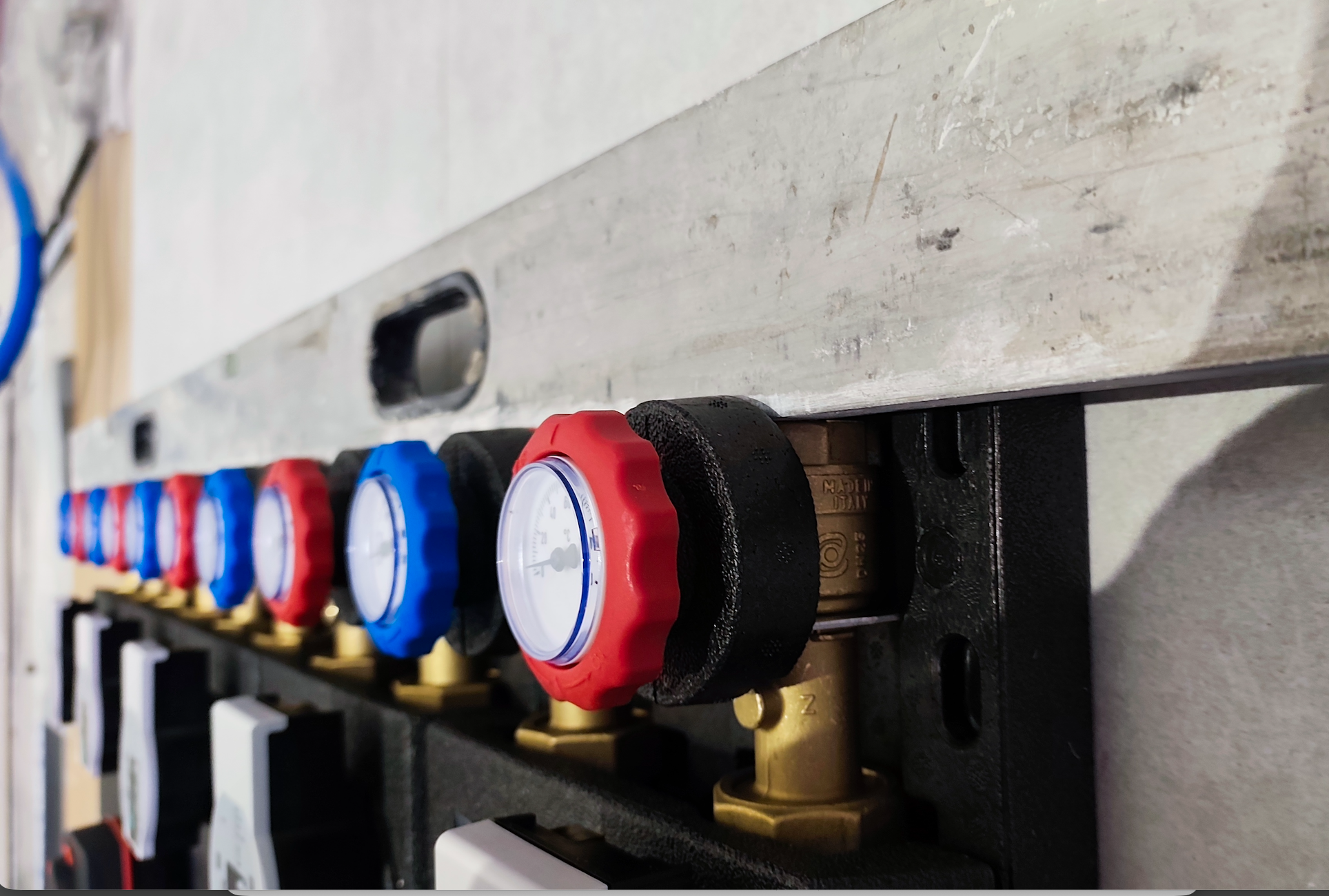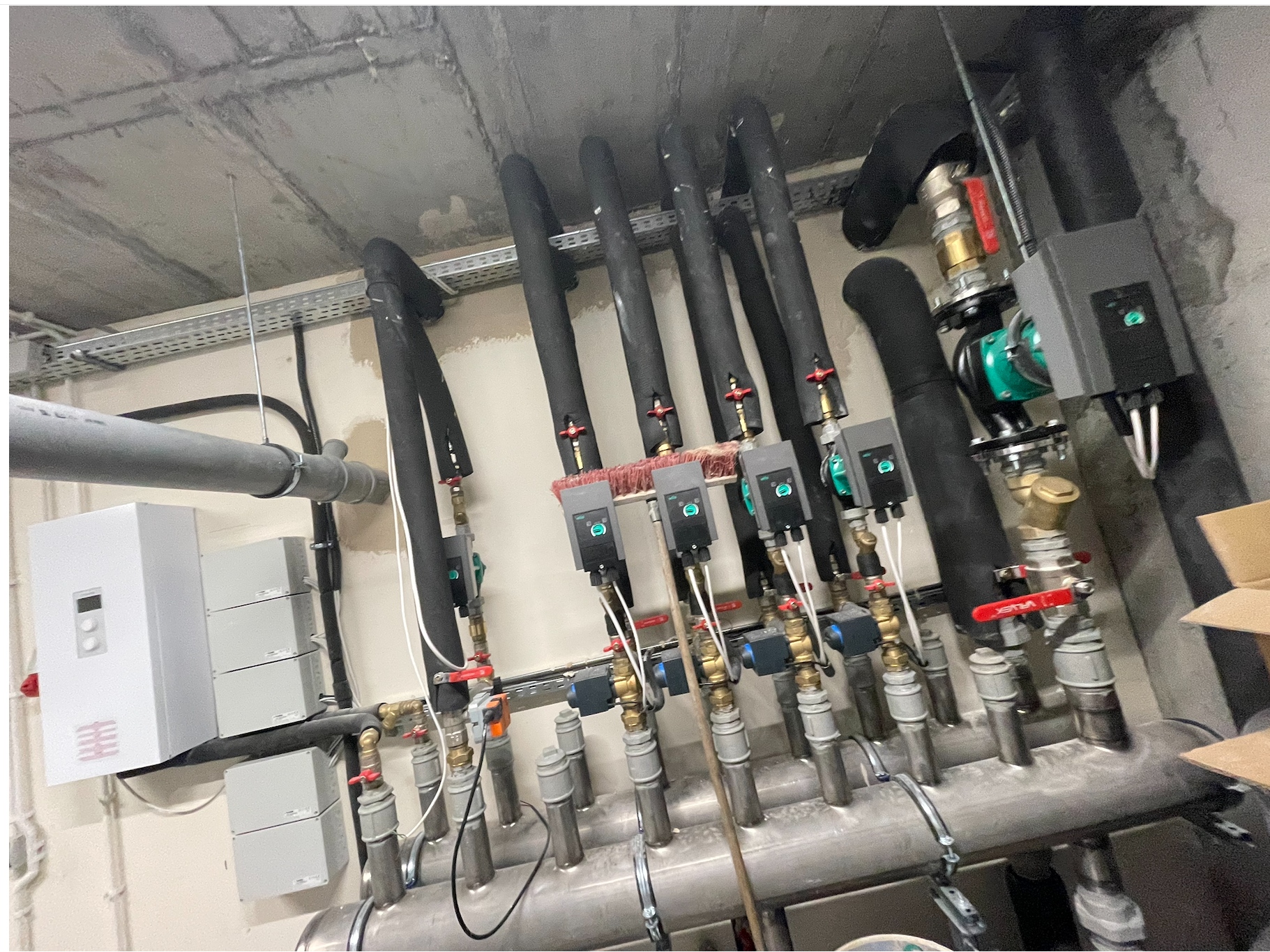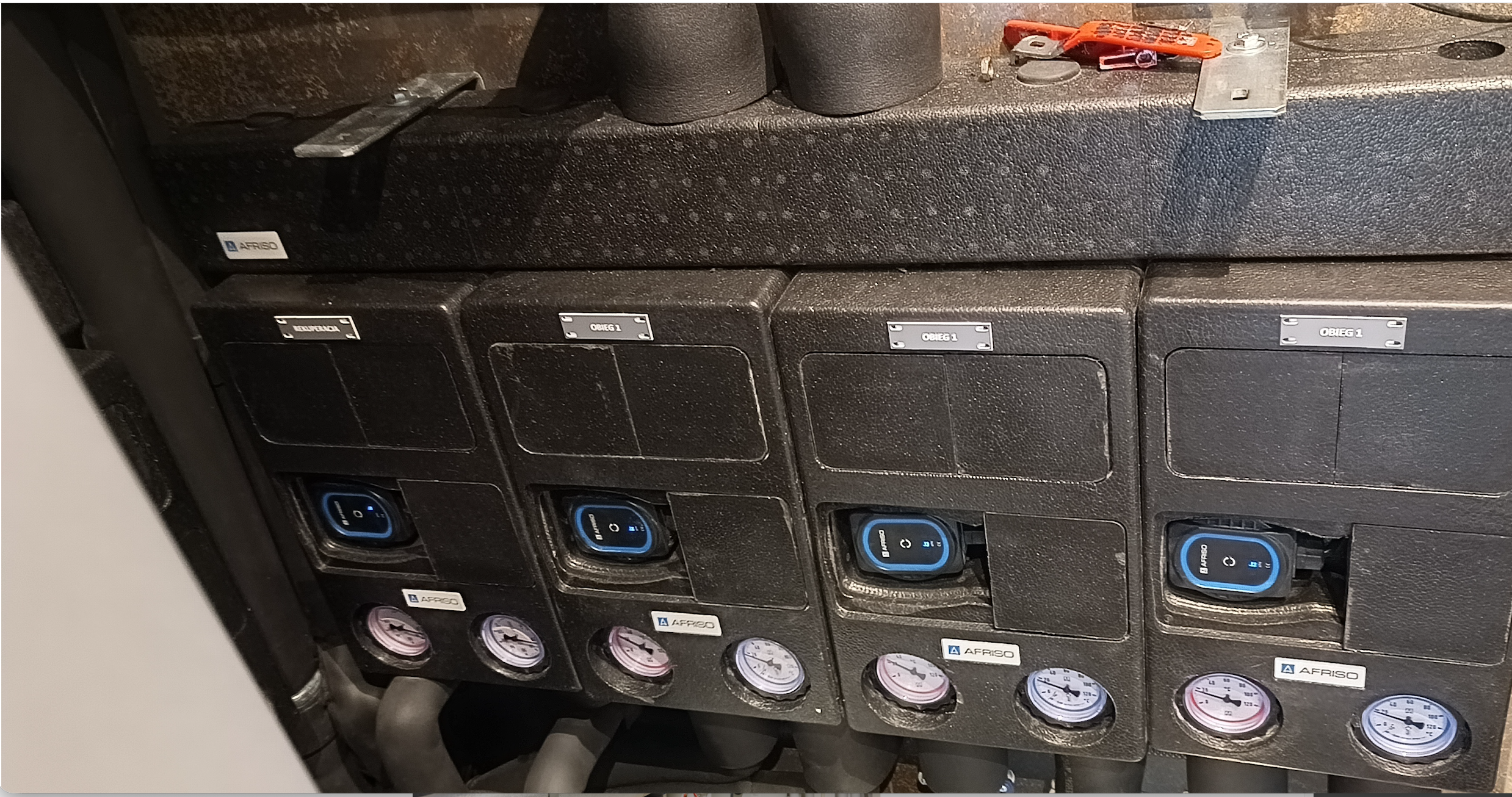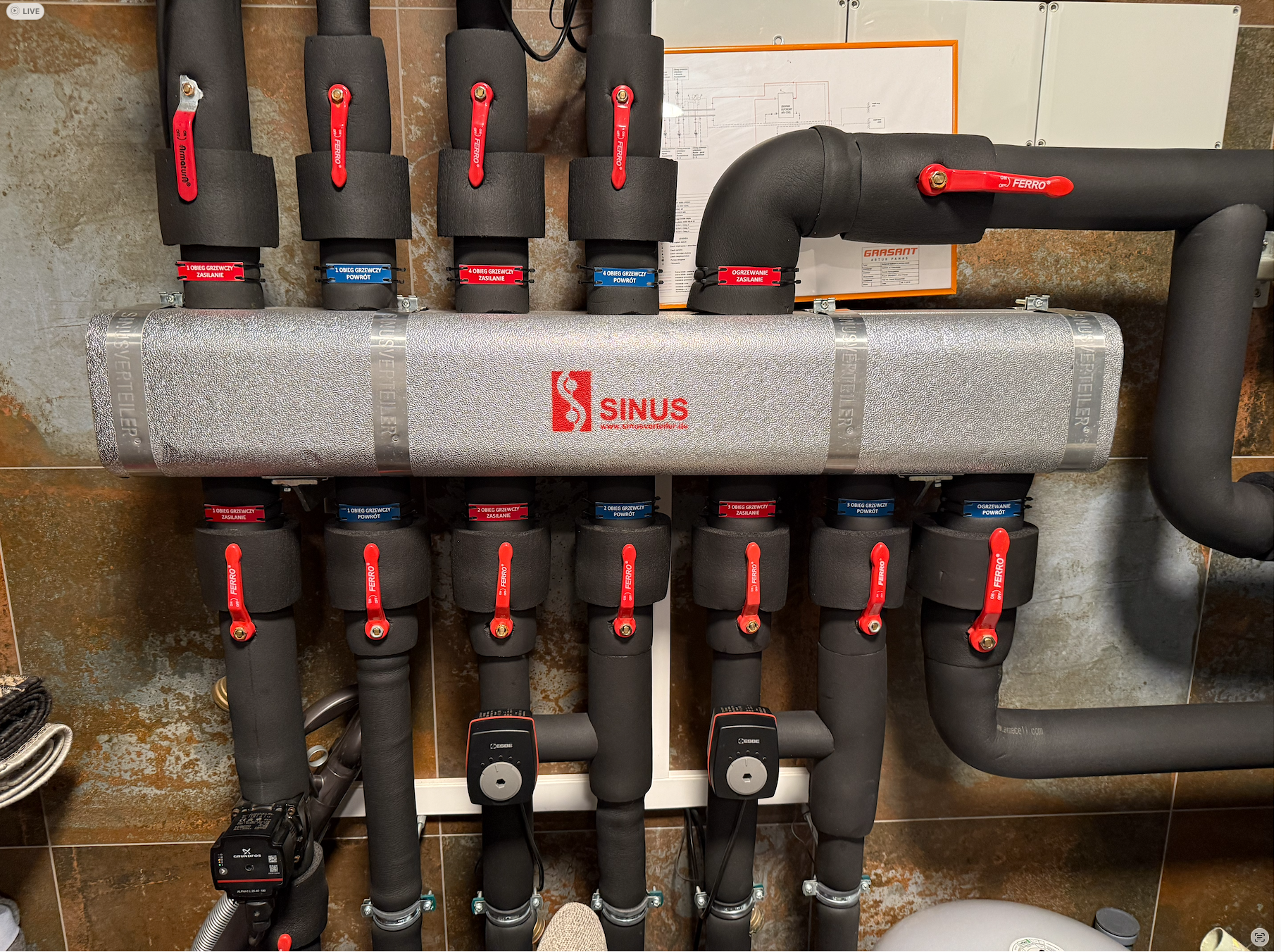 Zbiornik buforowy wody kotłowej pełni kilka funkcji – zwiększenie pojemności zładu, rozsprzęglenie obiegów grzewczych, jest Pierwszym obiegiem grzewczo / chłodzącym. Natomiast grupy pompowe zamontowane na rozdzielaczu głównym, przypisane są do każdej z dwóch kondygnacji. Obie wyposażone są w zawory mieszające. Dzięki takiemu układowi mam możliwość różnej konfiguracji / sterowania poszczególnymi funkcjami ogrzewania / chłodzenia parteru i piętra naszego domu. Dla obiegu Pierwszego (bufor) przypisana jest krzywa grzania i chłodzenia „X” – to jest najważniejsza krzywa. Co do zasady piętro potrzebuje więcej ciepła zimą i chłodu latem. Dzięki temu mogę dla piętra ustawić wyższe parametry pracy adekwatne dla danego sezonu, a dla parteru niższe. Natomiast gdy piętro nie jest / nie będzie codziennie używane (dzieci się wyprowadzą, okazjonalnie będą przebywali tam nasi goście) to na ten czas można zmienić nastawy w taki sposób, aby zimą utrzymywać tam niższą temperaturę niż na parterze. Oponenci powiedzą, że można zamontować czujniki temperatury pokojowej i uzyskać podobny efekt. Oczywiście, że można, ale ja uważam, że w pierwszym etapie powinno się sterować pracą źródła ciepła (chłodu) a nie odbiornikiem. Per analogia. Jadąc samochodem aby zmniejszyć prędkość nie powinno się wciskać pedału hamulca nie zmieniając położenia pedału gazu, tylko odpuścić gaz. Tym samym – korzystając z pracy pompy ciepła nie powinno ustawiać się wysokiej krzywej grzania po to, aby na odbiorniku i za pośrednictwem termostatu pokojowego ustawiać niższą temperaturę, niż wynika to z nastawy krzywej grzania … Taka praca jest nieekonomiczna i pobawiona logiki, dodatkowo / długofalowo wpływa na szybsze zużycie sprężarki.