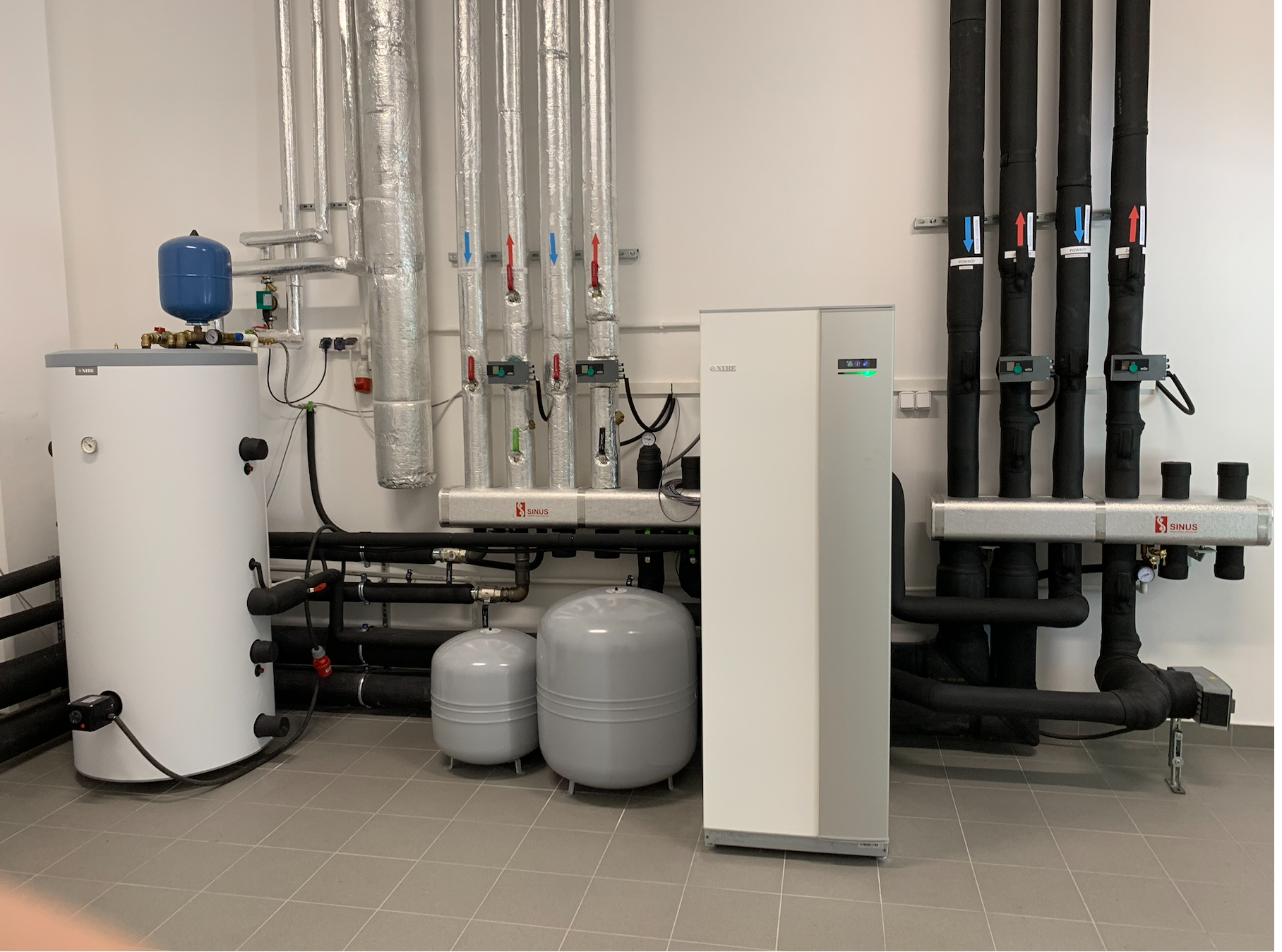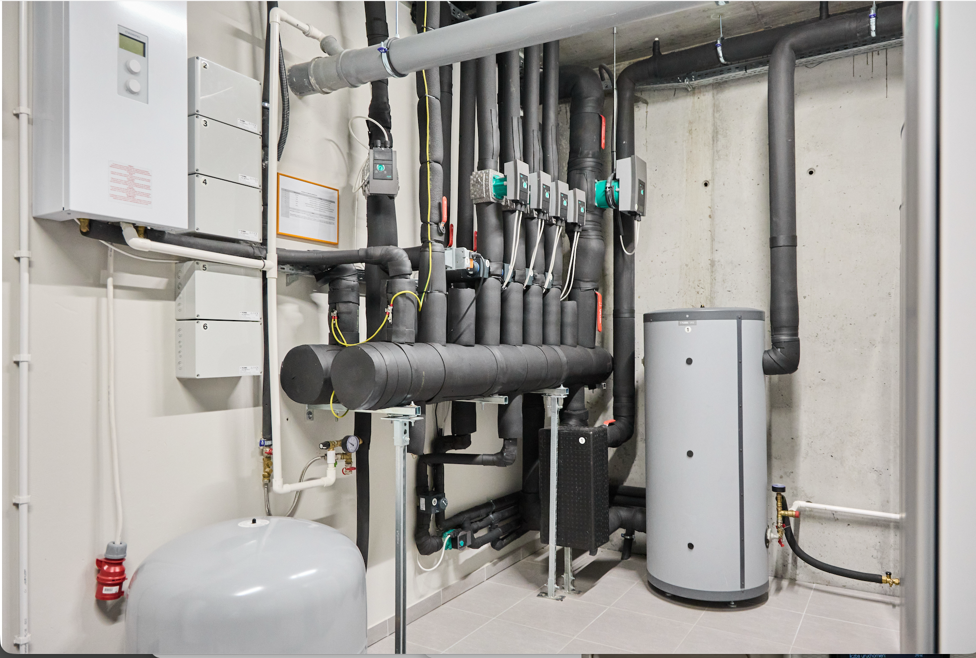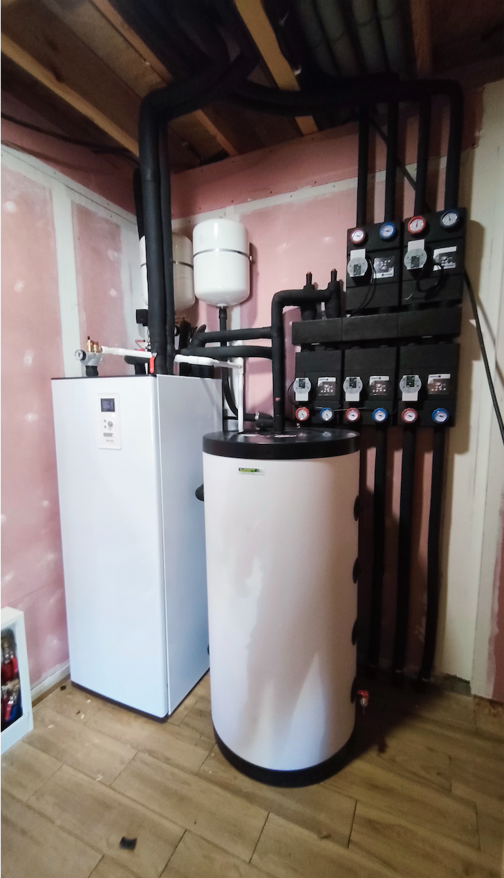 Natomiast w przypadku budownictwa jednorodzinnego, gdzie mamy do czynienia z budynkami mieszkalnymi o powierzchni ogrzewane / chłodzonej od stu-kilkudziesięciu do kilkuset metrów kwadratowych, zasadnym jest wykonanie rozwiązania technicznego nazwanego „technologia kotłowni”. Dzięki niemu mamy możliwość odpowiedniego doboru pomp obiegowych, zdefiniowania różnych temperatur wody kotłowej dla odmiennych instalacji odbiorczych – czy to ze względu na rodzaj (grzejniki płytowe / ogrzewanie podłogowe) czy też ze względu na wymagania danej strefy grzewczej ( pomieszczenia o wymaganej co do zasady wyższej temperaturze pokojowej od tych z niższą).