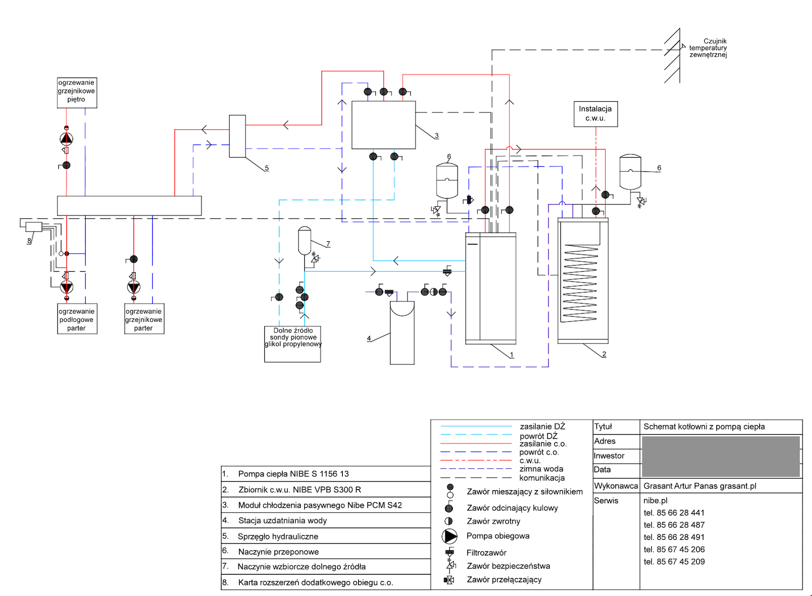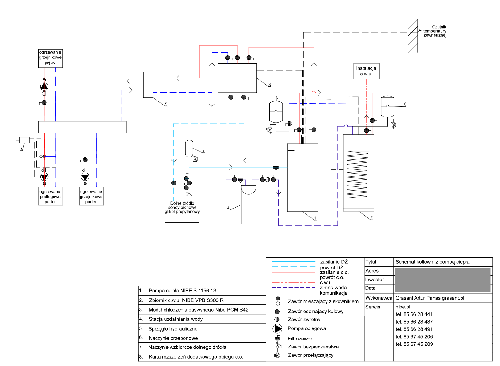 Przykładowo ad. 1 – mając dwa obiegi grzewcze w postaci ogrzewania grzejnikowego i podłogowego, możemy zastosować dwie grupy pompowe, z których pierwsza (dla grzejników) będzie sterowana wyższą temperaturą wody kotłowej a druga (dla podłogówki) niższą. Pierwsza będzie obiegiem bezpośrednim (tylko pompa obiegowa) a druga z podmieszaniem ( z zastosowanie zaworu trzy drogowego mieszającego z siłownikiem). Obie grupy pompowe będą sterowane z automatyki pompy ciepła, a do każdej z nich będzie przypisana inna krzywa grzania. W przypadku korzystania z funkcji chłodzenia – dla pierwszego obiegu (grzejników) funkcja chłodzenia będzie wyłączona, a dla funkcji ogrzewania podłogowego będzie włączona. Cały proces regulacji będzie odbywał się automatycznie, bez udziału / codziennego zaangażowania użytkownika i zmieniał swoje działanie (lato / zima) względem temperatury powietrza zewnętrznego i wody kotłowej, aby efektem końcowym był komfort mieszkania. Włączamy, ustawiamy, regulujemy w pierwszym / drugim sezonie grzewczem dla indywidualnych potrzeb a latach następnych „działa już samo”.